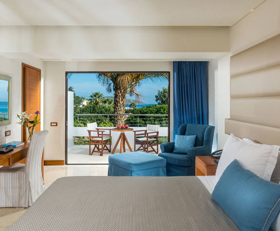 Cozy luxury perfected. Your room features a sumptuous modern design and refreshing hues to put your spirit at ease. The breathtaking view of the sea from your balcony or patio is enough to immerse you in a fairytale of a vacation. Travelers seeking chic seaside living and top-of-the-line Greek services that can be tailored to their tastes need look no further. This accommodation is ideal for two to three guests.