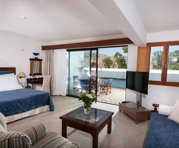 The perfect blend of elegance and personalized convenience for your luxurious family vacation in Greece. Lounge in the sun or dine on decadent dishes on your cozy veranda overlooking the lush garden and Crete’s enchanting landscape beyond. Space and carefully designed comfort define this whole suite, its bright and warm colors elevating its atmosphere and your experience to profound heights. These suites embody relaxation and style, catering to groups of up to three guests.